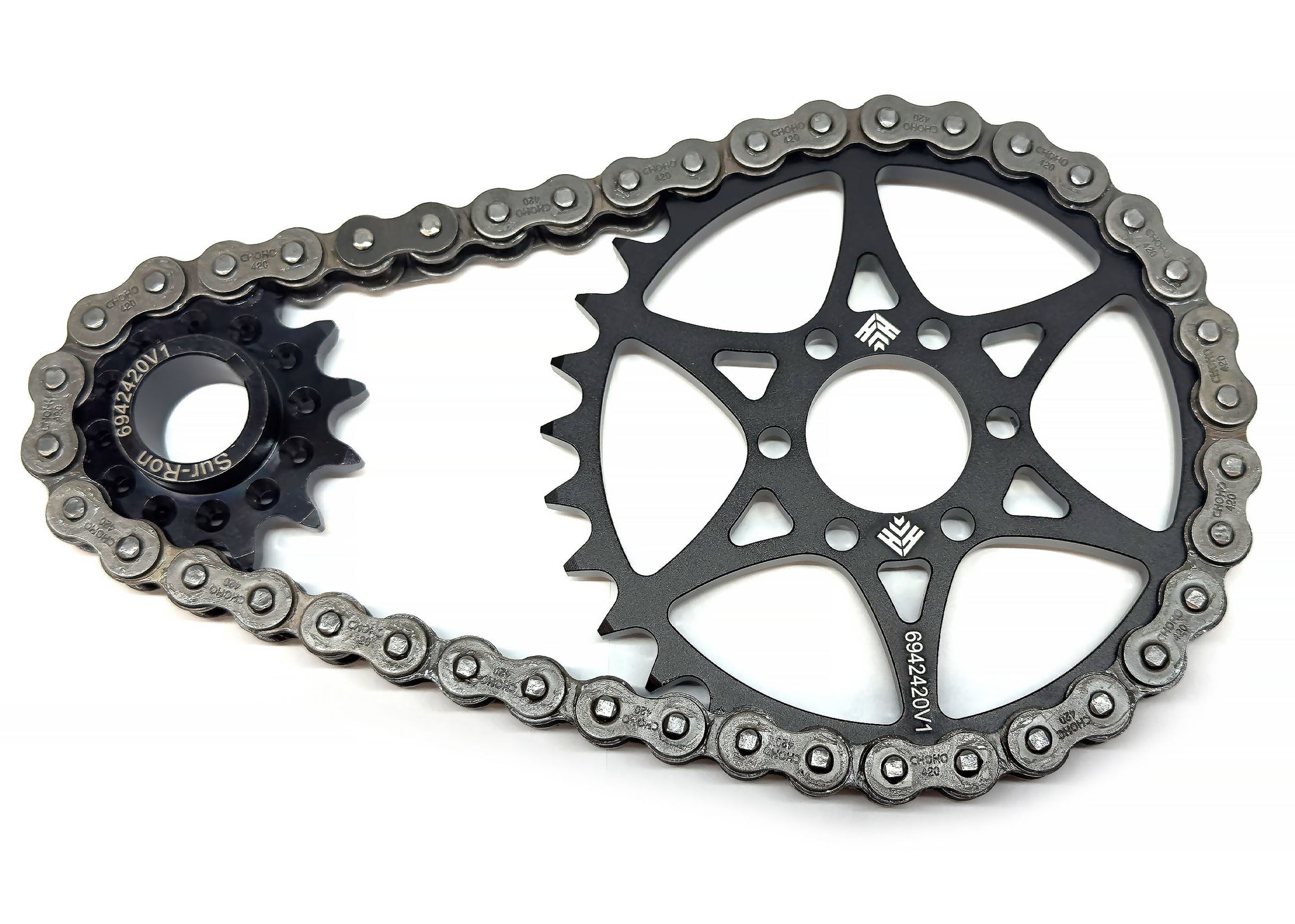 The conversion maintains OEM motor alignment and gear ratio, with precision machining that extends sprocket life and keeps performance smooth at high RPM. It’s louder than a belt — no avoiding that — but no louder than any other chain kit. And if you want to quiet it down, you can fit an O-ring chain (at the cost of some performance). From stock power setups to high-output EBMX, Sotion, or Torp builds, this kit is race-proven and built for abuse.
